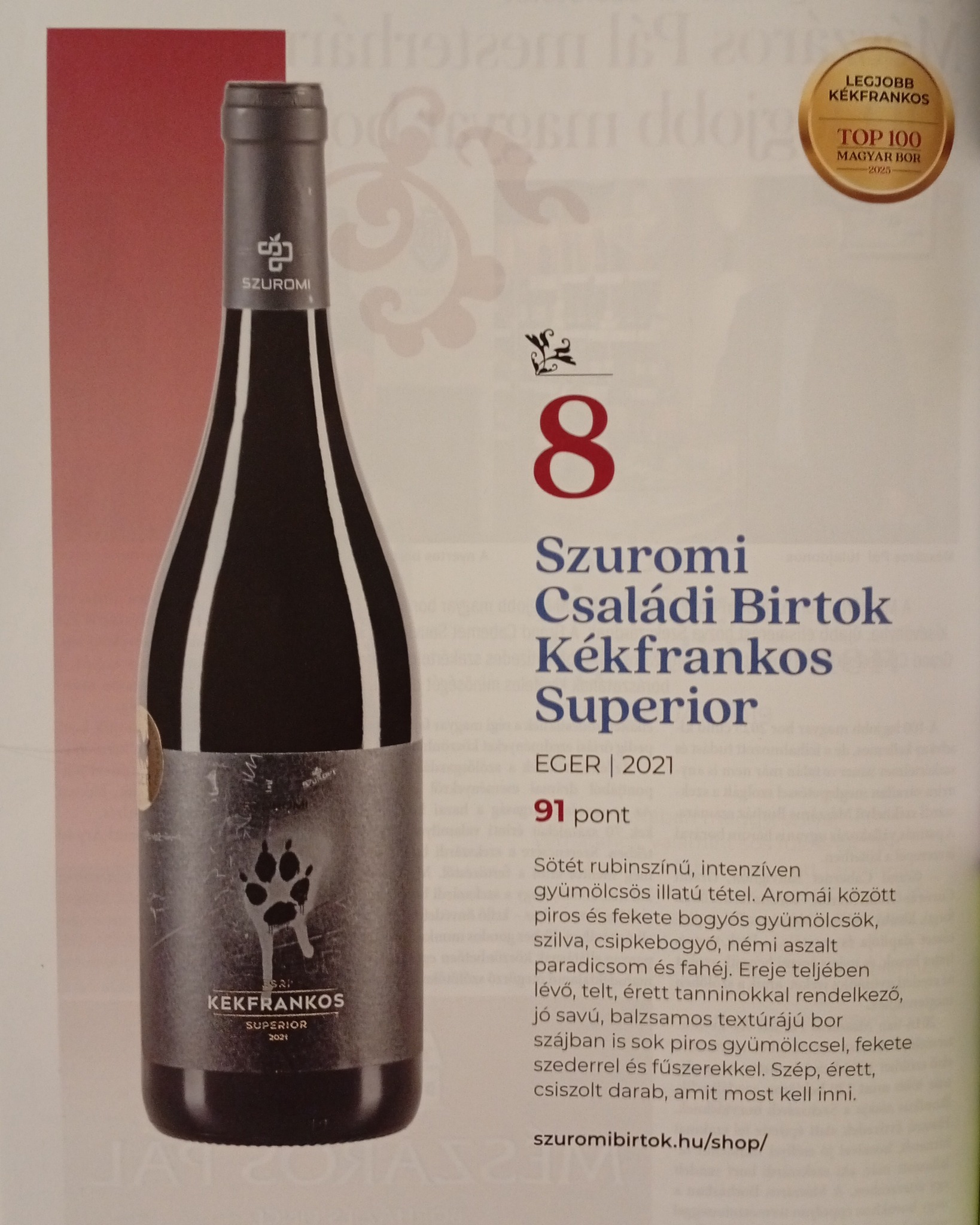 Szuromi Egri Kékfrankos Superior 2021: A legjobb Kékfrankos és a Top 10 Legjobb Magyar Bor egyikének választotta a TOP 100 Magyar Bor kiadványának nemzetközi borakadémikusokból álló zsűrije a 2021-es évjáratú Szuromi Egri Kékfrankos Superiort!